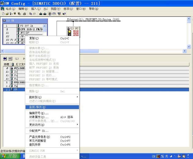 STEP7 硬件配置的 ONLINE 模式提供簡(jiǎn)易的在線(xiàn)調(diào)試功能,可以操作現(xiàn)場(chǎng)變頻器, 檢查配置和接線(xiàn)是否正確。在 ONLINE 模式,PLC 運(yùn)行狀態(tài)下,選中從站丹佛斯變頻器的 圖標(biāo),再點(diǎn)擊從站的 1.2 插槽,示例中顯示為“PPO 4 – 6/6 Words,Danf~”模塊,按鼠標(biāo) 右鍵,選擇“監(jiān)視/修改(M)”。