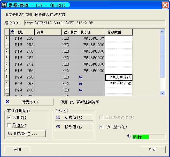 這時(shí)寫(xiě)入 PCD1 控制字(示例中地址為 PQW 256) = W#16#047C(此控制字含義為“運(yùn) 行”);寫(xiě)入 PCD2 總線(xiàn)參考值(示例中地址為 PQW 258)= W#16#1000(含義為 25%),然 后按“修改值(I)”按鈕,數(shù)據(jù)就能傳送至變頻器,如果此時(shí)變頻器在 Auto-on 模式,控制 端子 12 與 27 短接,變頻器就能正常運(yùn)行,而且輸出頻率為 12.5Hz。