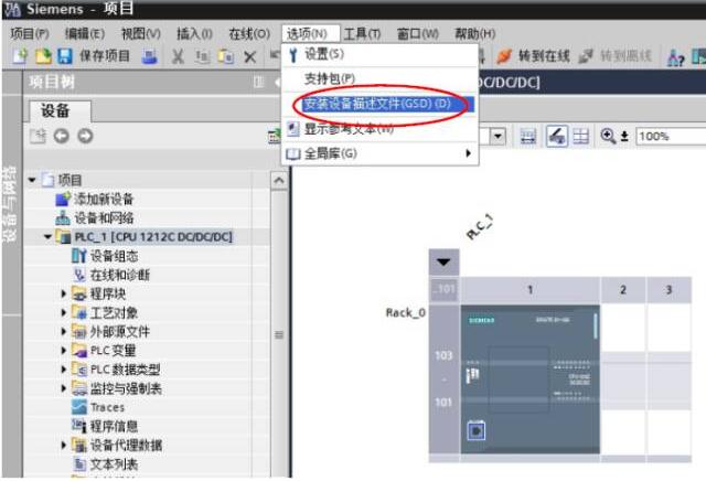 六、如果沒(méi)有安裝過(guò) MCA120 的 GSD 文件,則需點(diǎn)擊‘選項(xiàng)’-‘安裝設(shè)備描述文件’,操作 如圖五所示。若已安裝則直接進(jìn)入第六步。