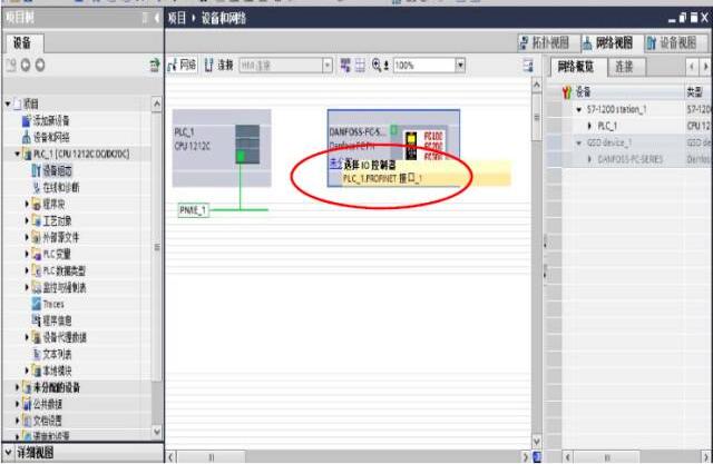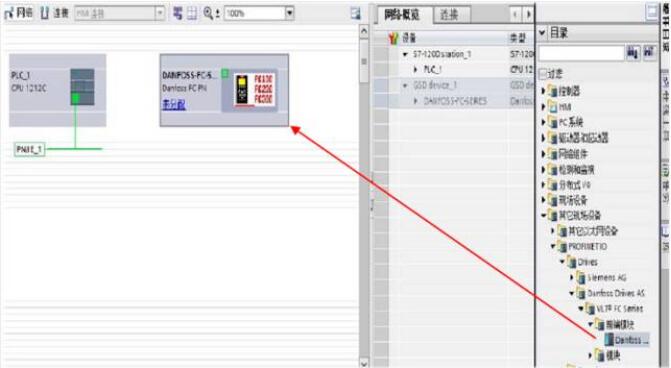 十、網(wǎng)絡(luò)配置:將丹佛斯變頻器加入到 ProfiNET 網(wǎng)絡(luò)總線上,點(diǎn)擊‘設(shè)備和網(wǎng)絡(luò)’-‘選 擇變頻器’-‘選擇 I/O 控制器’-‘PLC1_-PROFINET 接口_1’,如圖十一所示,配置完成 后,如圖十二所示:
