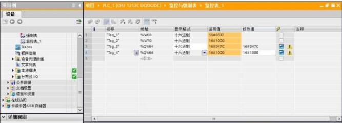 十三、調(diào)試:TIA 軟件提供在線調(diào)試功能,可以現(xiàn)場(chǎng)操作變頻器,檢查配置和接線是否正確。 在在線模式下,在監(jiān)控表中添加‘%IW68(STW)’、 ‘%IW70(MAV)’、 ‘%QW64(CTW)’、 ‘%QW66(MRV)’、如圖十四所示: