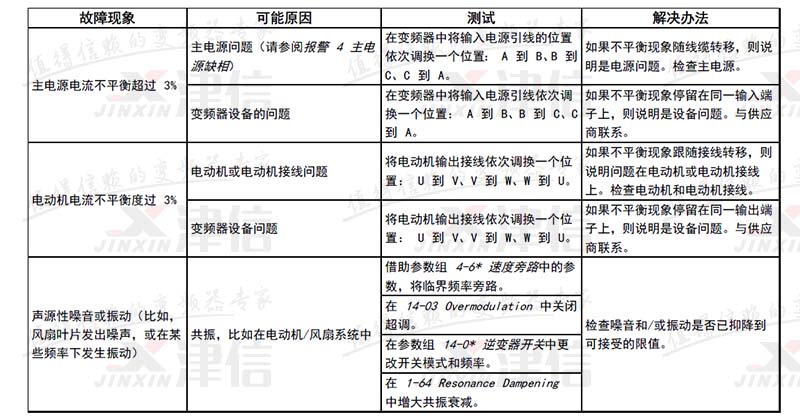 | 4 | 主電源缺相 1) | X | X | X | 供電側(cè)缺相,或電壓嚴重失衡。檢查供電電壓。 |