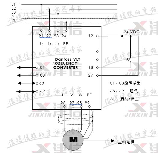 變頻器與主軸電機的系統組成及控制端子接線如圖所示: