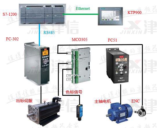 PLC與觸摸屏之間進行Ethernet通訊,PLC與丹佛斯FC302變頻器之間進行RS485通信,通過觸摸屏可以設置標長、對標位置、出標起始位置等工藝參數;FC302變頻器控制出標伺服電機,以保證出標精度及響應精度。