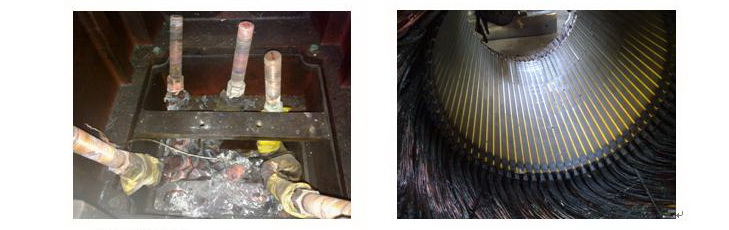電機檢查:將電機的接線盒打開后發現,電機的接線柱子已近完全燒壞。后將電機全部拆開發現內部繞組完全燒毀。見下圖: