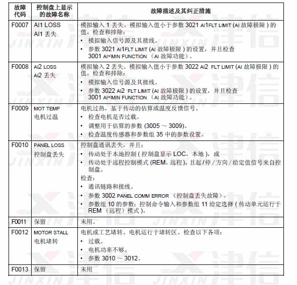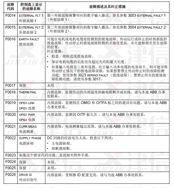 可以通過(guò)MENU/ENTER鍵來(lái)清除故障信息。如果故障依然存在,故障信息會(huì)在幾秒鐘后再次出現(xiàn)。此時(shí)需要根據(jù)故障代碼來(lái)進(jìn)行相應(yīng)的檢查和采取應(yīng)對(duì)措施。