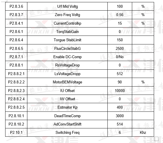 4) 設(shè)定變頻器的P2.1.5到P2.1.11的電機參數(shù)。