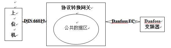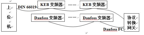 為了節(jié)省投資,變頻器替換采取逐步進行方式,即損壞一臺KEB變頻器,替換一臺。也就是說系統(tǒng)中將同時存在兩種變頻器和兩種協(xié)議。現(xiàn)在要開發(fā)的通訊協(xié)議轉(zhuǎn)換網(wǎng)關(guān)就是要使其對上位機而言,丹佛斯依然被視作DIN 66019協(xié)議的數(shù)據(jù)設(shè)備;而對于Danfoss變頻器而言,還是在Danfoss FC協(xié)議控制下工作。此外,根據(jù)功能需求分析,該協(xié)議轉(zhuǎn)換網(wǎng)關(guān)需要具有伸縮性,即增加Danfoss變頻器時,需要將新增加的Danfoss變頻器包裝成DIN 66019協(xié)議下的設(shè)備,而不管丹佛斯變頻器的數(shù)量多少,在上位機看來,它們應(yīng)該是DIN 66019協(xié)議下的與原KEB變頻器沒有任何沖突的設(shè)備。兩種協(xié)議并存的結(jié)構(gòu)框圖如圖2所示。