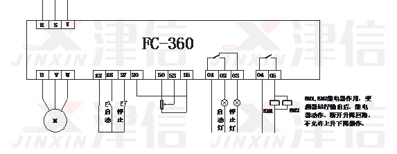 放線過程中,F(xiàn)C360根據(jù)反饋位置與預(yù)置位置進行PID調(diào)節(jié)運算,確定電機的轉(zhuǎn)速與轉(zhuǎn)向。當(dāng)出現(xiàn)斷線情況,擺桿由于重力作用將下落,位置反饋值會超出設(shè)定的允許范圍。如果將變頻器的繼電器1的輸出功能設(shè)為“反饋值超出范圍”,這時繼電器1就會動作。根據(jù)接線圖1,繼電器1動作時,端子01/03將斷開,斷開自動運行控制回路,變頻器將會立即停止輸出,同時端子01/02將閉合,將報警信號送給上位機。