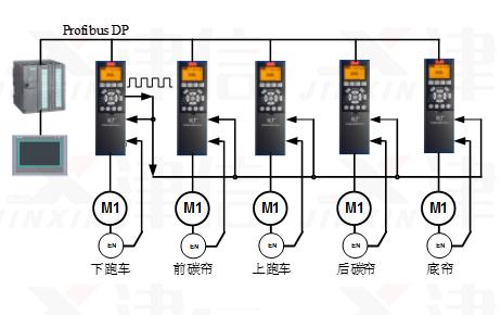 驅(qū)動系統(tǒng)的整體結(jié)構(gòu)如圖四,每根軸獨立按自己的電子凸輪曲線運行,屬于典型的分布式控制系統(tǒng),對主控制器的性能要求,一般的PLC就能勝任。由于每根軸都與主軸保持電子凸輪同步關(guān)系,所以總體上可以實現(xiàn)多軸同步的控制需求。其中下跑車運動控制器比較特殊,他具有虛擬主軸脈沖輸出的功能,代替主控制器發(fā)送主軸脈沖信號。