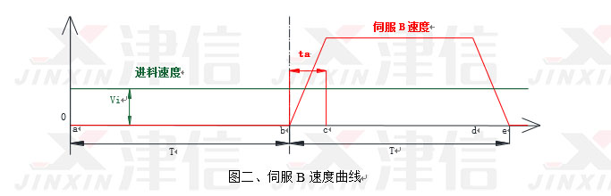 新型鋪網(wǎng)機的工作原理見圖一,其中伺服A為下跑車的驅(qū)動伺服,決定了下跑車的運行速度;下跑車就是鋪網(wǎng)頭,下跑車的速度就是鋪網(wǎng)機的鋪網(wǎng)速度。伺服B驅(qū)動前碳簾運行,前碳簾a段速度是鋪網(wǎng)機的原料輸入速度,要與前端設(shè)備速度同步。伺服C驅(qū)動上跑車運行。伺服D驅(qū)動后碳簾運行。伺服E驅(qū)動底簾運行。前碳簾在下跑車出口處的速度就是原料的出口速度。如果要求均勻鋪網(wǎng),則出料速度必須等于下跑車速度的絕對值;另外要求原料輸入速度要等于Vi,保持恒定不變。根據(jù)上述兩條基本運動約束條件,可以分別推算出各臺伺服在鋪網(wǎng)時的運行速度特征曲線。