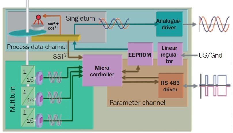 HIPERFACE編碼器是一種串行絕對位置和正余弦模擬量信號混合編碼器,內部原理框圖見圖1。