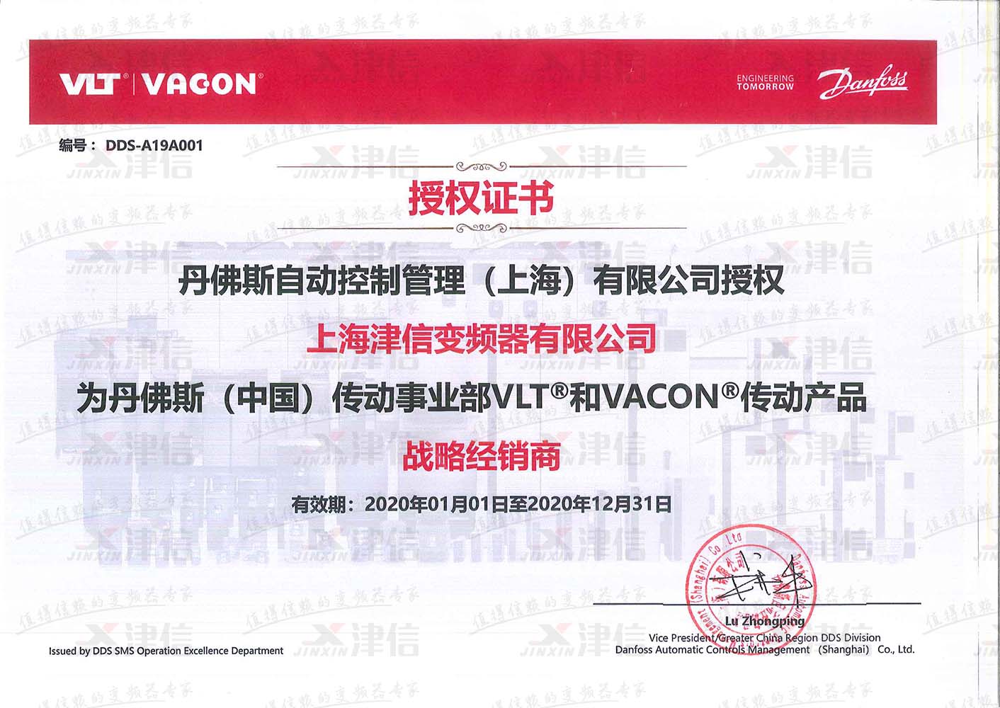 丹佛斯傳動(dòng)戰(zhàn)略經(jīng)銷(xiāo)商上海津信授權(quán)證書(shū)